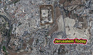 This image shows modern Jerusalem and the Temple Mount area, including the Western Wall, the Islamic Shrine the Dome of the Rock, and the Al Aqsa mosque.