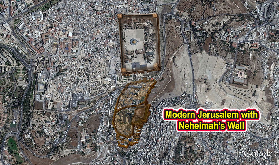 Modern day Jerusalem with a overlay of the ancient city described in Nehemiah.